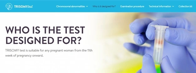 Take a look at this page of Trisomytest. One of the pages they display on their domain’s header menu is ‘who is it designed for?’. When you click on it, you will see an immediate answer on the top of the website and comprehensive information further down below.